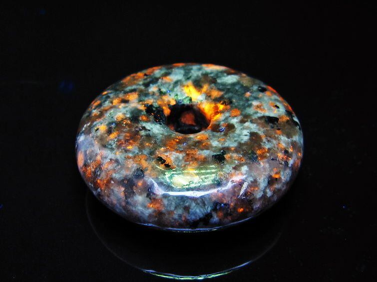 自然光の下では変哲の無い石ですが、ブラックライトなどの紫外線を照射すると強いオレンジ色の蛍光が確認できます。