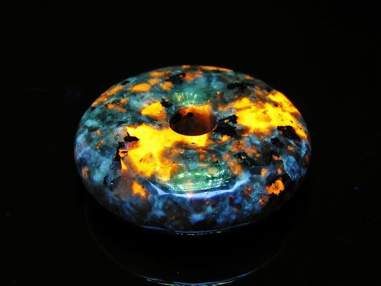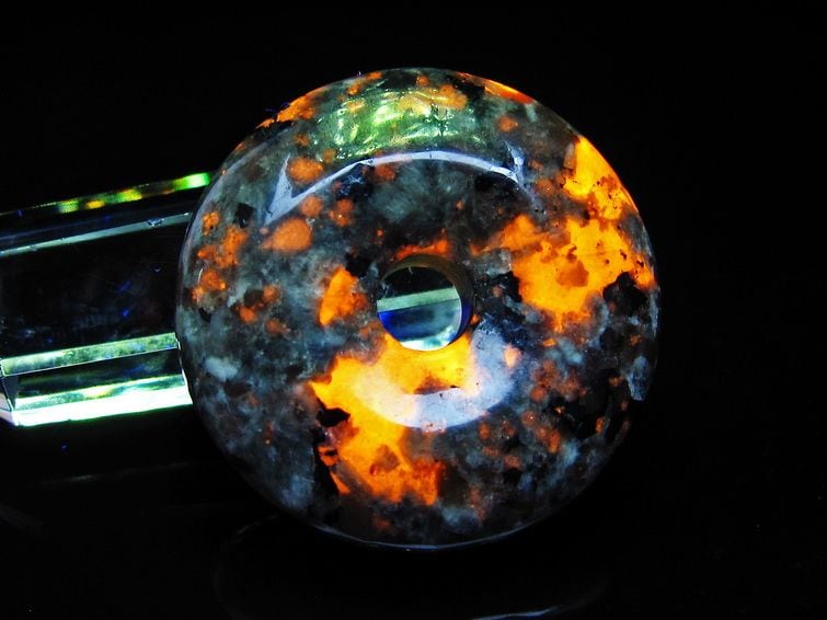 自然光の下では変哲の無い石ですが、ブラックライトなどの紫外線を照射すると強いオレンジ色の蛍光が確認できます。