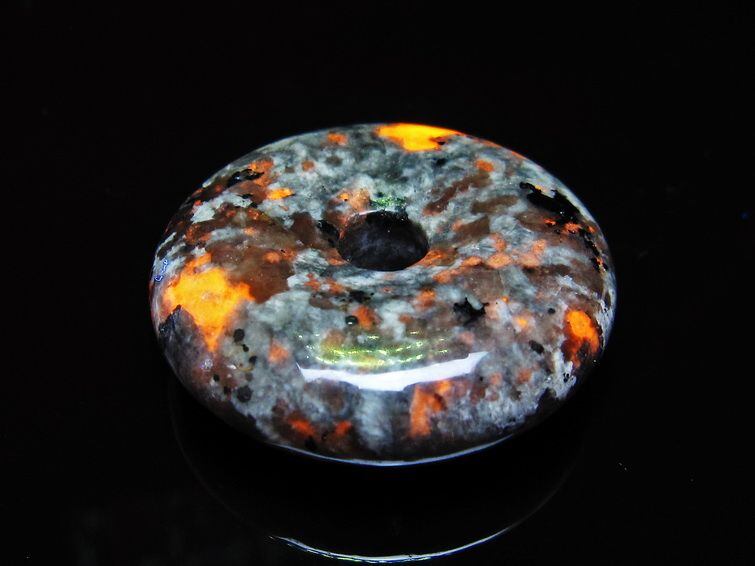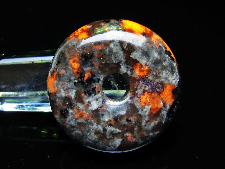自然光の下では変哲の無い石ですが、ブラックライトなどの紫外線を照射すると強いオレンジ色の蛍光が確認できます。