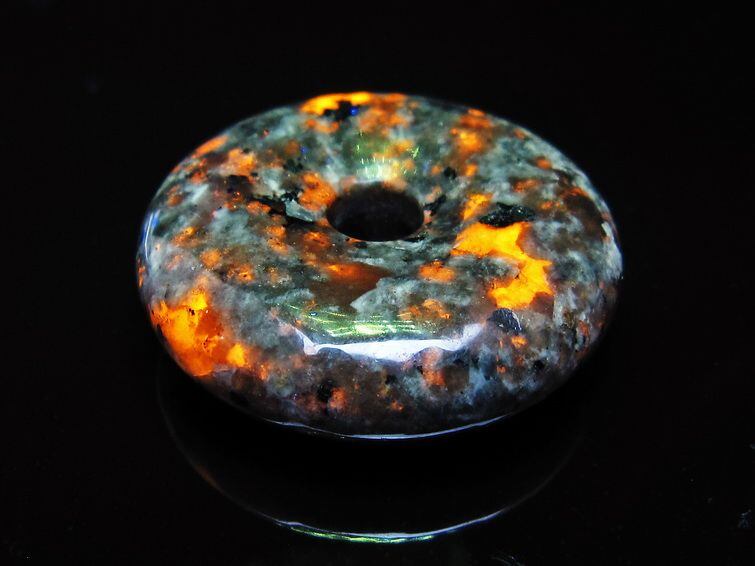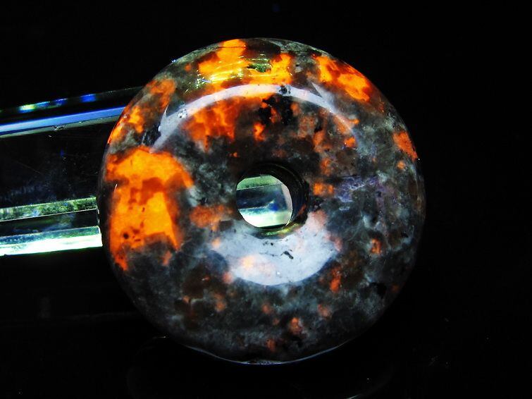自然光の下では変哲の無い石ですが、ブラックライトなどの紫外線を照射すると強いオレンジ色の蛍光が確認できます。
