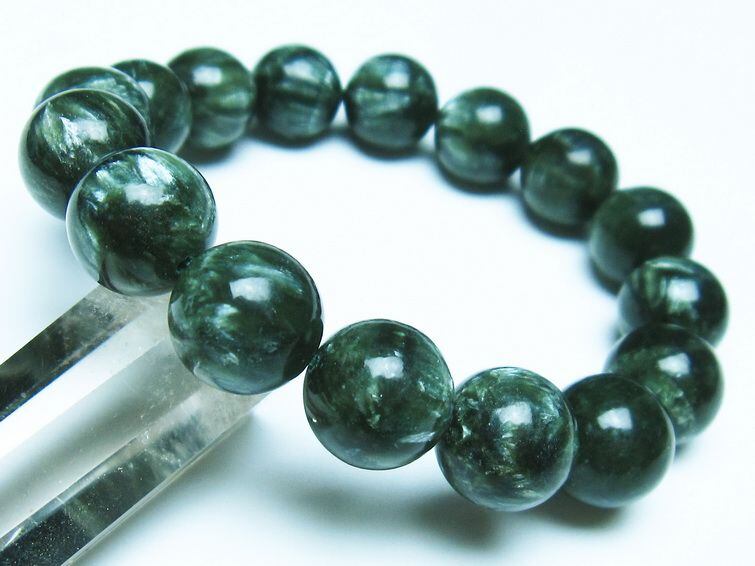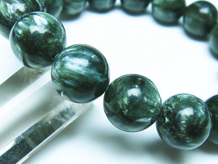 セラフィナイトは流通名で、鉱物としての正式名称はクリノクロアと言います。クローライト(緑泥石)に属する鉱物で、ロシアのバイカル湖付近では特に良質なセラフィナイトが産出されます。
