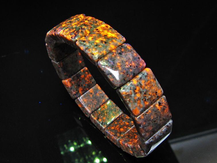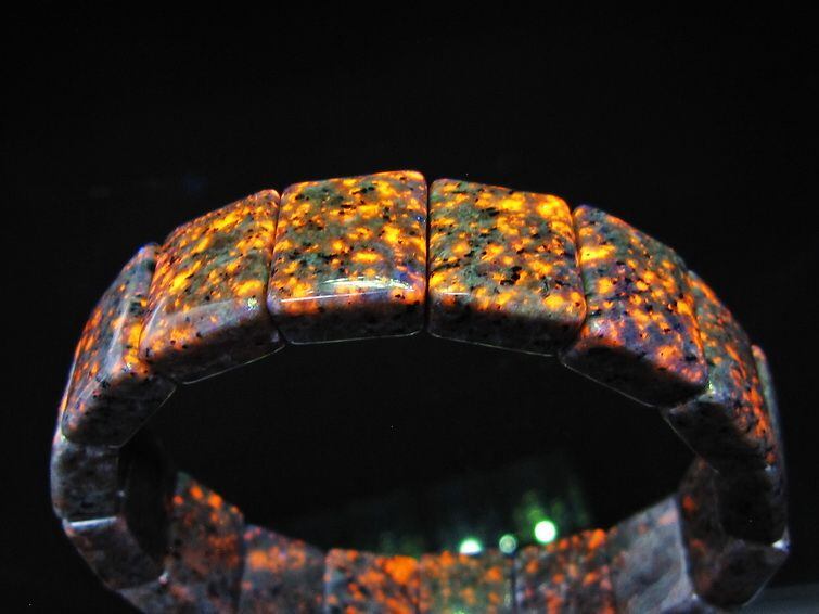 自然光の下では変哲の無い石ですが、ブラックライトなどの紫外線を照射すると強いオレンジ色の蛍光が確認できます。