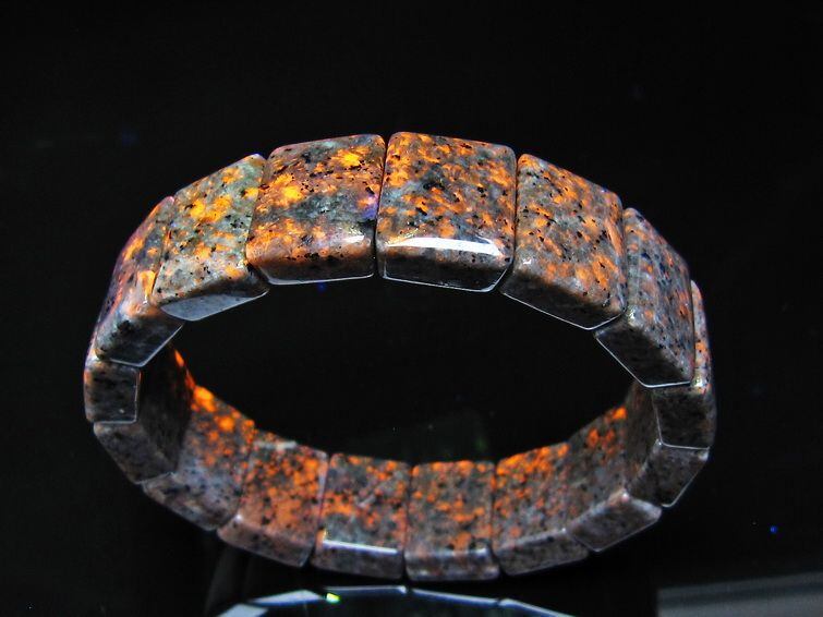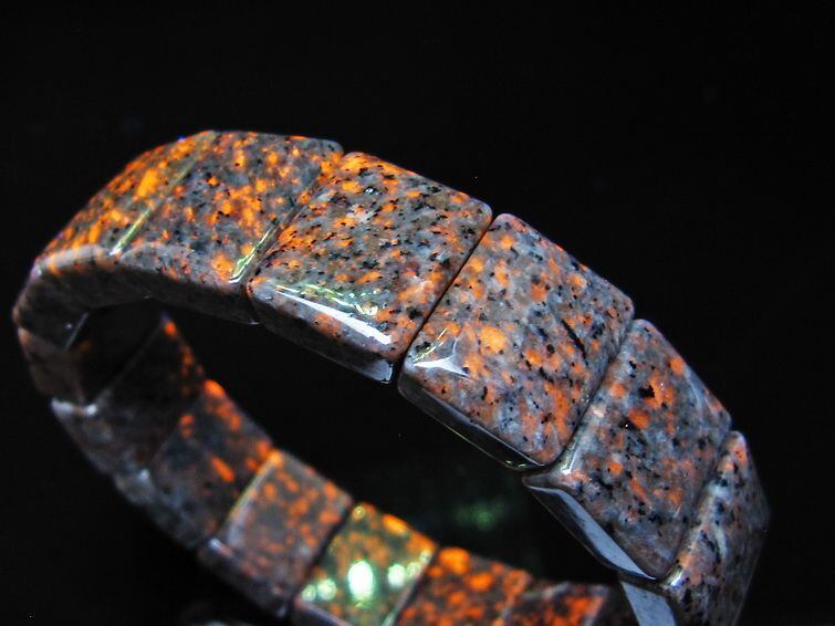 自然光の下では変哲の無い石ですが、ブラックライトなどの紫外線を照射すると強いオレンジ色の蛍光が確認できます。