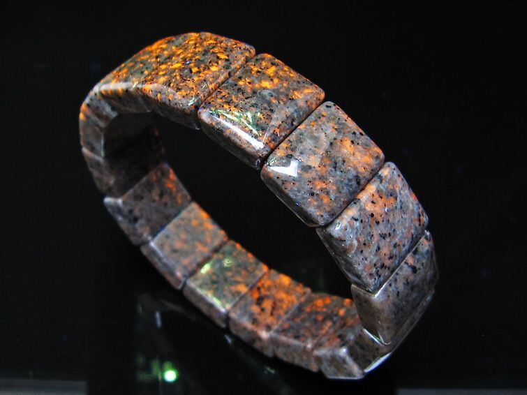 自然光の下では変哲の無い石ですが、ブラックライトなどの紫外線を照射すると強いオレンジ色の蛍光が確認できます。