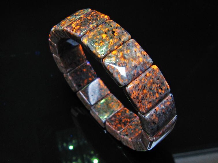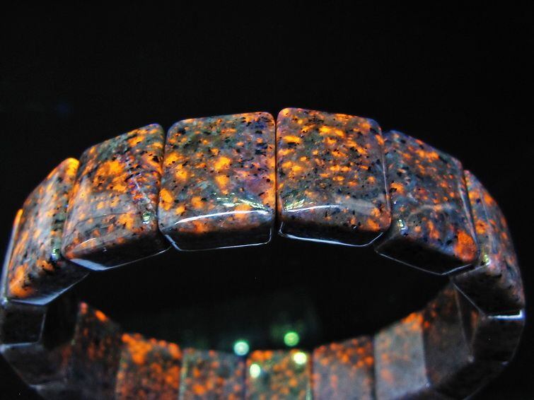 自然光の下では変哲の無い石ですが、ブラックライトなどの紫外線を照射すると強いオレンジ色の蛍光が確認できます。