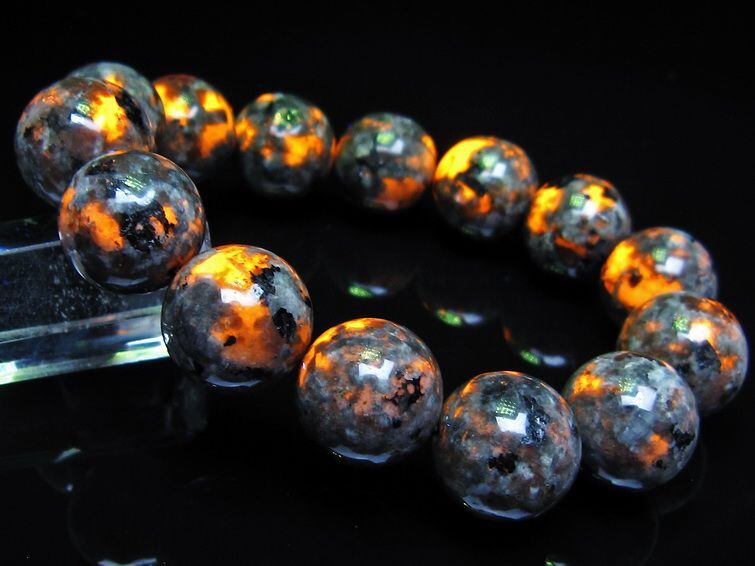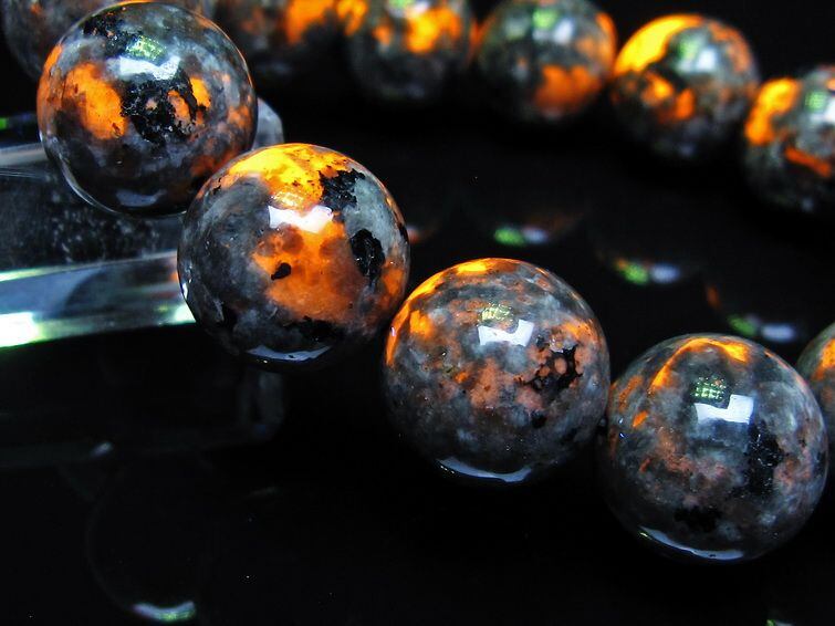 自然光の下では変哲の無い石ですが、ブラックライトなどの紫外線を照射すると強いオレンジ色の蛍光が確認できます。