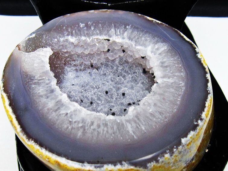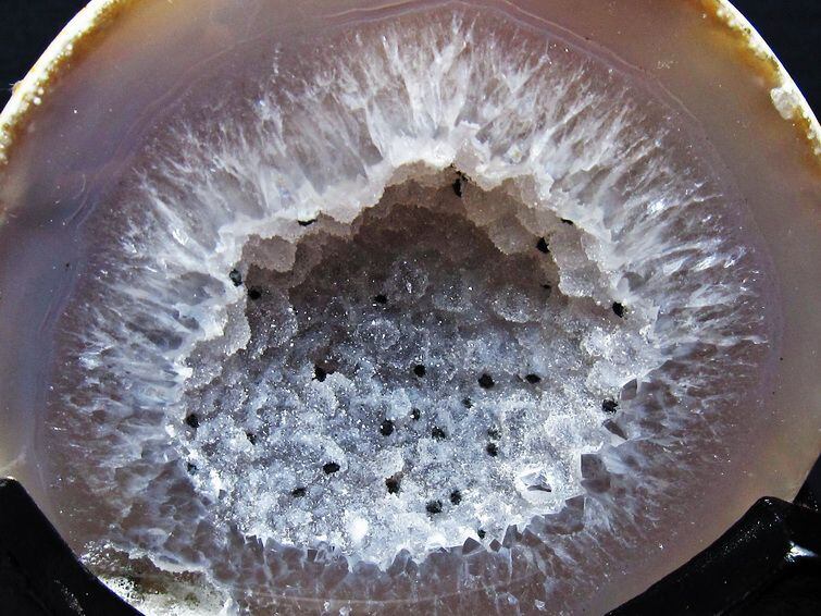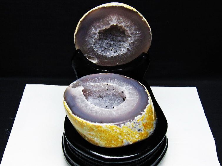 アゲート(瑪瑙)の原石を二つに切ったもので、中には空洞があり、周囲にびっしりと水晶の結晶が並んでいるパワーストーンです。このぽっかりと開いたくぼみ(龍穴)に気が集まるスポットが作り出され、運気上昇に繋がるとされます。龍穴(りゅうけつ)とは、風水における繁栄する土地の事で、龍穴がある場所は天変地異とも無縁であるとされます。