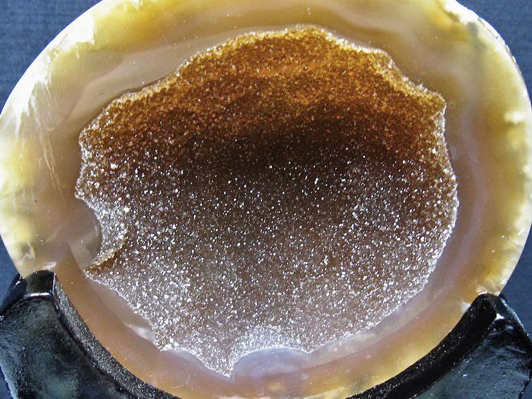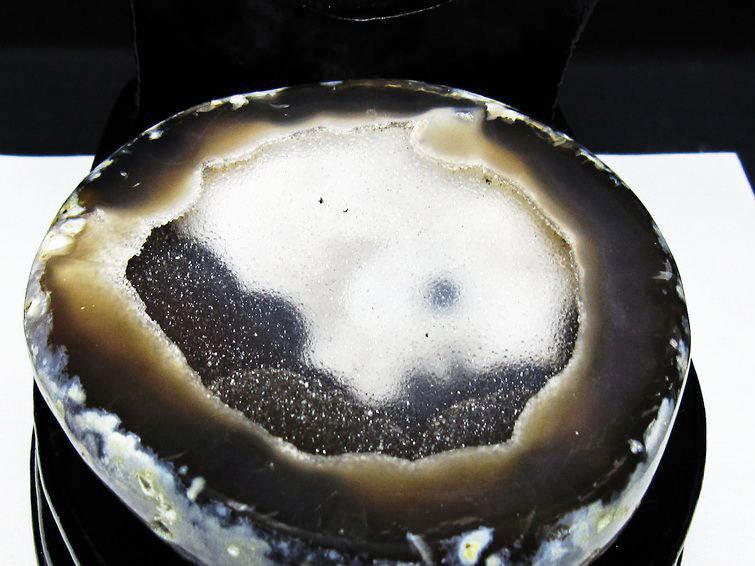 アゲート(瑪瑙)の原石を二つに切ったもので、中には空洞があり、周囲にびっしりと水晶の結晶が並んでいるパワーストーンです。このぽっかりと開いたくぼみ(龍穴)に気が集まるスポットが作り出され、運気上昇に繋がるとされます。龍穴(りゅうけつ)とは、風水における繁栄する土地の事で、龍穴がある場所は天変地異とも無縁であるとされます。