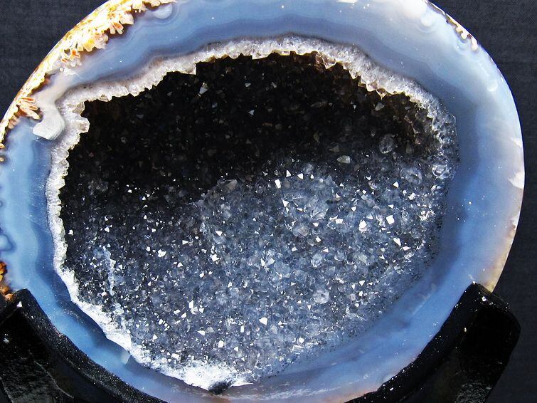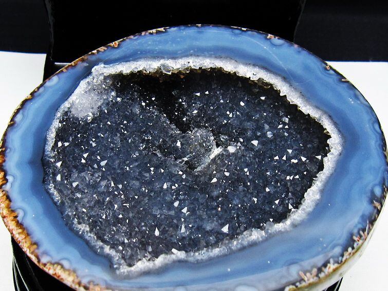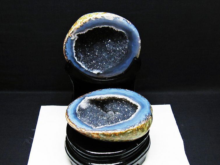 アゲート(瑪瑙)の原石を二つに切ったもので、中には空洞があり、周囲にびっしりと水晶の結晶が並んでいるパワーストーンです。このぽっかりと開いたくぼみ(龍穴)に気が集まるスポットが作り出され、運気上昇に繋がるとされます。龍穴(りゅうけつ)とは、風水における繁栄する土地の事で、龍穴がある場所は天変地異とも無縁であるとされます。