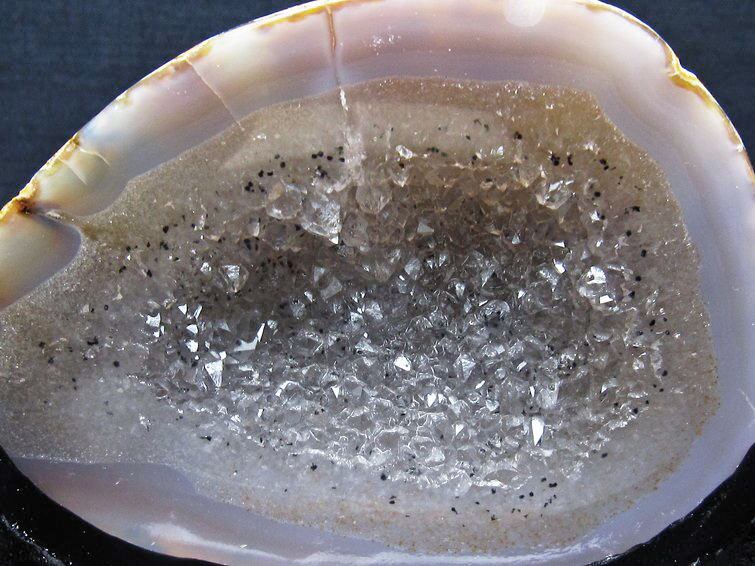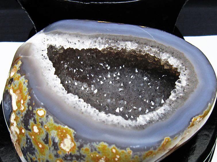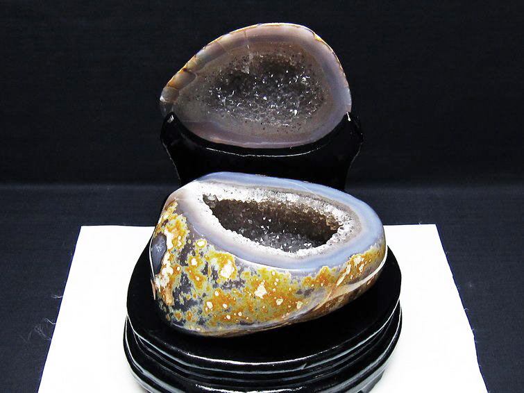 アゲート(瑪瑙)の原石を二つに切ったもので、中には空洞があり、周囲にびっしりと水晶の結晶が並んでいるパワーストーンです。このぽっかりと開いたくぼみ(龍穴)に気が集まるスポットが作り出され、運気上昇に繋がるとされます。龍穴(りゅうけつ)とは、風水における繁栄する土地の事で、龍穴がある場所は天変地異とも無縁であるとされます。