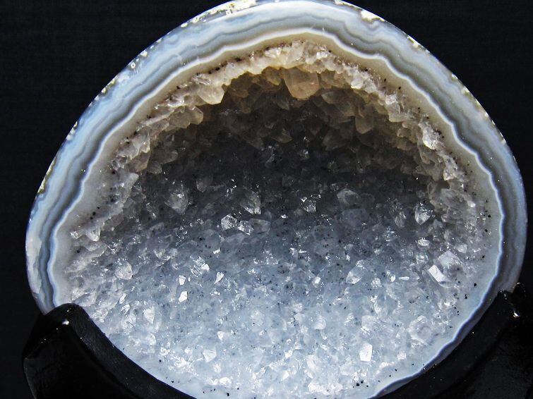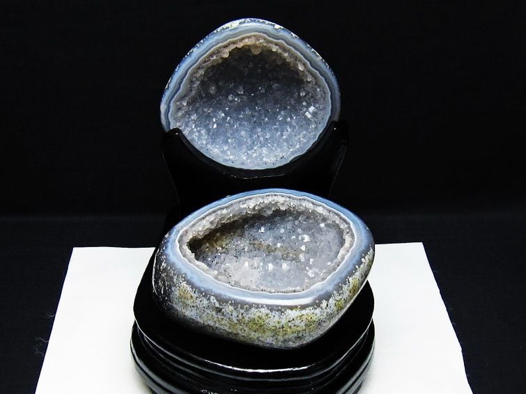 アゲート(瑪瑙)の原石を二つに切ったもので、中には空洞があり、周囲にびっしりと水晶の結晶が並んでいるパワーストーンです。このぽっかりと開いたくぼみ(龍穴)に気が集まるスポットが作り出され、運気上昇に繋がるとされます。龍穴(りゅうけつ)とは、風水における繁栄する土地の事で、龍穴がある場所は天変地異とも無縁であるとされます。