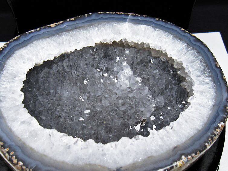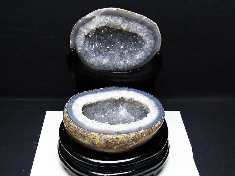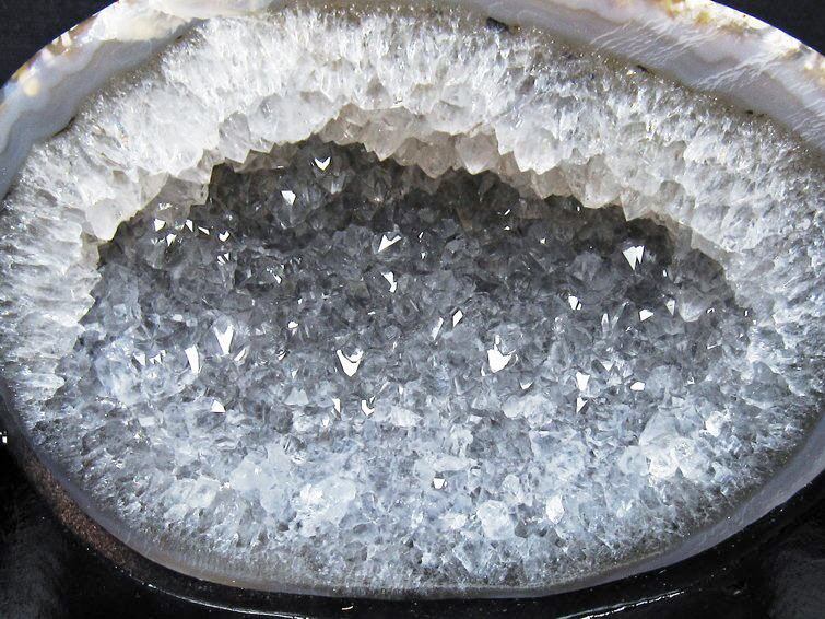 アゲート(瑪瑙)の原石を二つに切ったもので、中には空洞があり、周囲にびっしりと水晶の結晶が並んでいるパワーストーンです。このぽっかりと開いたくぼみ(龍穴)に気が集まるスポットが作り出され、運気上昇に繋がるとされます。龍穴(りゅうけつ)とは、風水における繁栄する土地の事で、龍穴がある場所は天変地異とも無縁であるとされます。