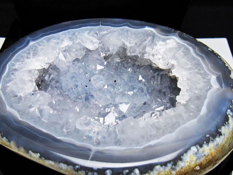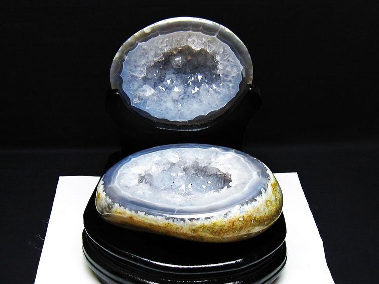 アゲート(瑪瑙)の原石を二つに切ったもので、中には空洞があり、周囲にびっしりと水晶の結晶が並んでいるパワーストーンです。このぽっかりと開いたくぼみ(龍穴)に気が集まるスポットが作り出され、運気上昇に繋がるとされます。龍穴(りゅうけつ)とは、風水における繁栄する土地の事で、龍穴がある場所は天変地異とも無縁であるとされます。