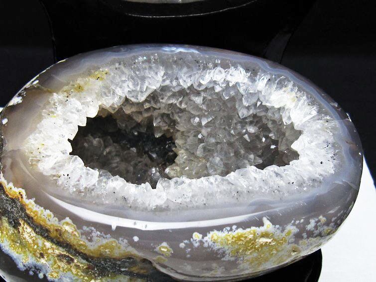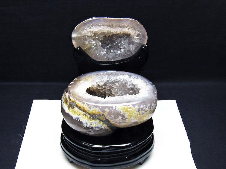 アゲート(瑪瑙)の原石を二つに切ったもので、中には空洞があり、周囲にびっしりと水晶の結晶が並んでいるパワーストーンです。このぽっかりと開いたくぼみ(龍穴)に気が集まるスポットが作り出され、運気上昇に繋がるとされます。龍穴(りゅうけつ)とは、風水における繁栄する土地の事で、龍穴がある場所は天変地異とも無縁であるとされます。