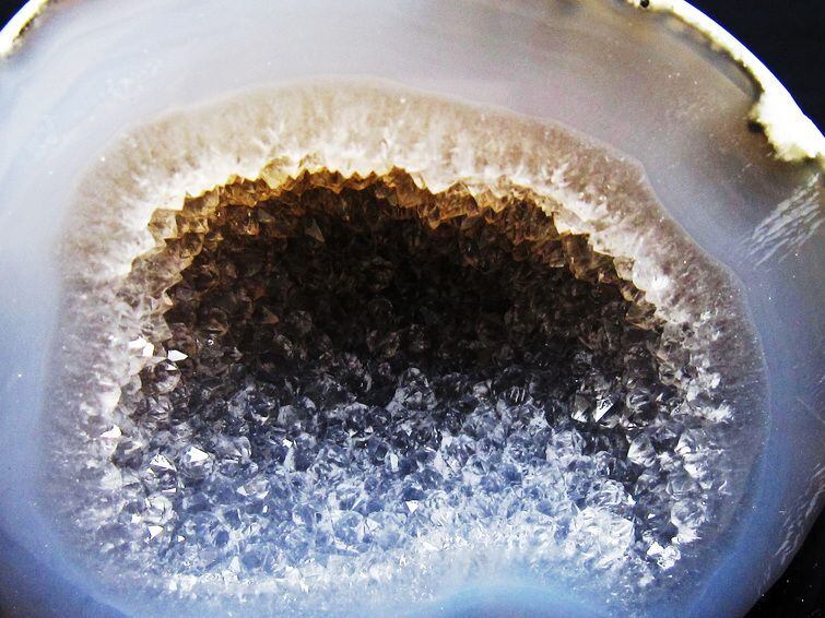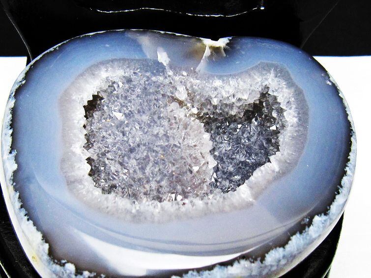 アゲート(瑪瑙)の原石を二つに切ったもので、中には空洞があり、周囲にびっしりと水晶の結晶が並んでいるパワーストーンです。このぽっかりと開いたくぼみ(龍穴)に気が集まるスポットが作り出され、運気上昇に繋がるとされます。龍穴(りゅうけつ)とは、風水における繁栄する土地の事で、龍穴がある場所は天変地異とも無縁であるとされます。