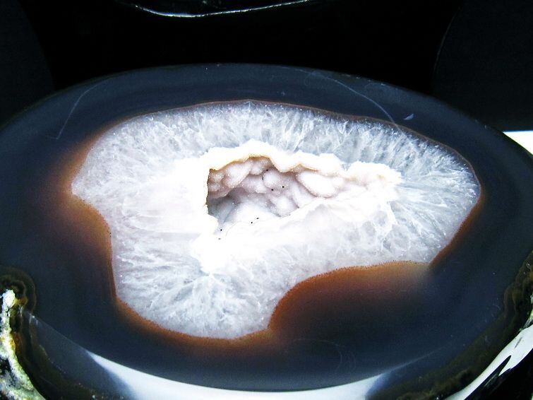 アゲート(瑪瑙)の原石を二つに切ったもので、中には空洞があり、周囲にびっしりと水晶の結晶が並んでいるパワーストーンです。このぽっかりと開いたくぼみ(龍穴)に気が集まるスポットが作り出され、運気上昇に繋がるとされます。龍穴(りゅうけつ)とは、風水における繁栄する土地の事で、龍穴がある場所は天変地異とも無縁であるとされます。