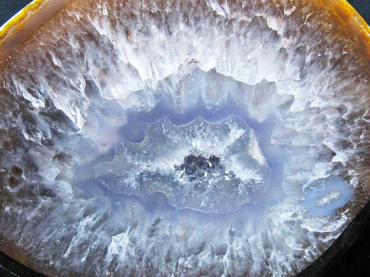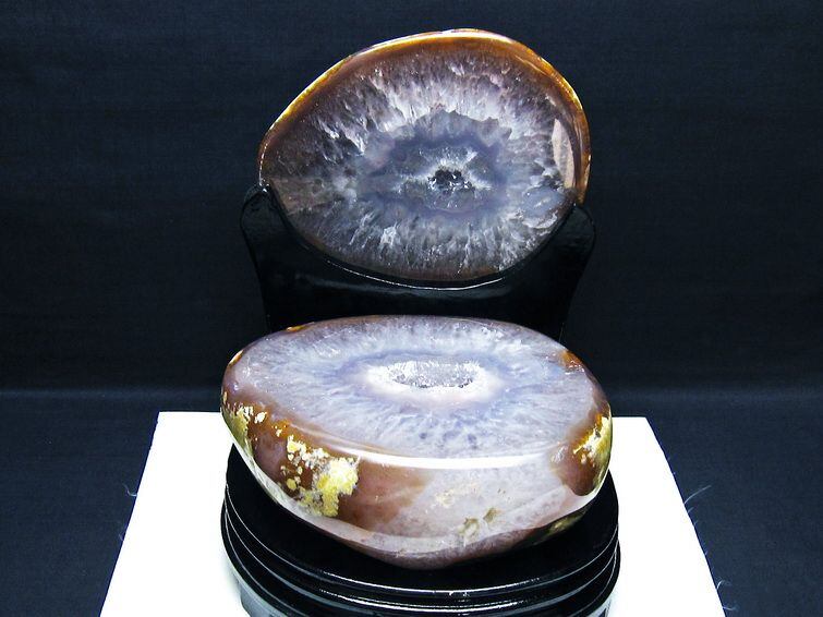 アゲート(瑪瑙)の原石を二つに切ったもので、中には空洞があり、周囲にびっしりと水晶の結晶が並んでいるパワーストーンです。このぽっかりと開いたくぼみ(龍穴)に気が集まるスポットが作り出され、運気上昇に繋がるとされます。龍穴(りゅうけつ)とは、風水における繁栄する土地の事で、龍穴がある場所は天変地異とも無縁であるとされます。