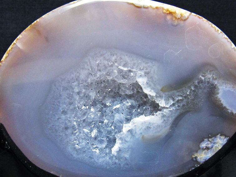 アゲート(瑪瑙)の原石を二つに切ったもので、中には空洞があり、周囲にびっしりと水晶の結晶が並んでいるパワーストーンです。このぽっかりと開いたくぼみ(龍穴)に気が集まるスポットが作り出され、運気上昇に繋がるとされます。龍穴(りゅうけつ)とは、風水における繁栄する土地の事で、龍穴がある場所は天変地異とも無縁であるとされます。