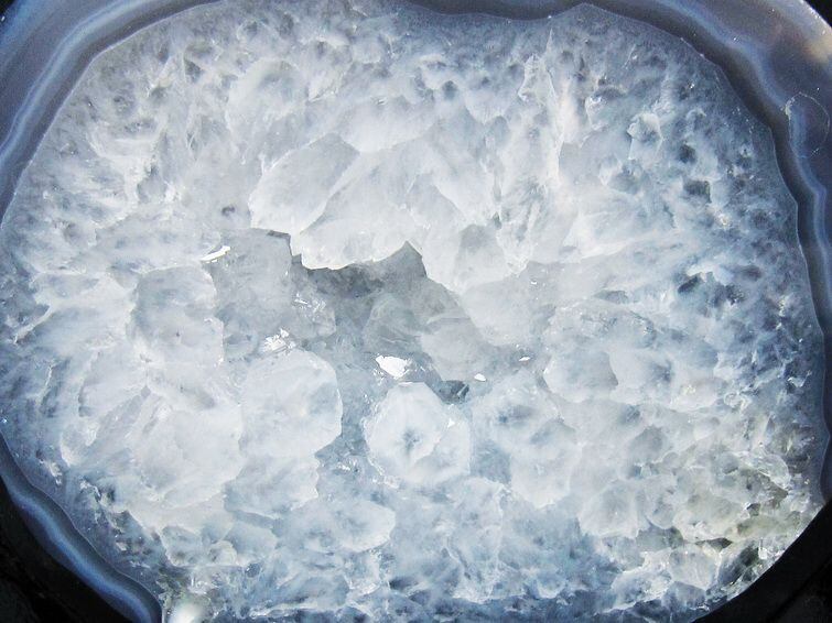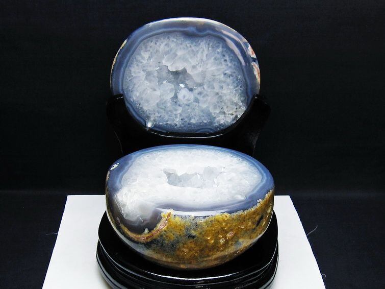 アゲート(瑪瑙)の原石を二つに切ったもので、中には空洞があり、周囲にびっしりと水晶の結晶が並んでいるパワーストーンです。このぽっかりと開いたくぼみ(龍穴)に気が集まるスポットが作り出され、運気上昇に繋がるとされます。龍穴(りゅうけつ)とは、風水における繁栄する土地の事で、龍穴がある場所は天変地異とも無縁であるとされます。