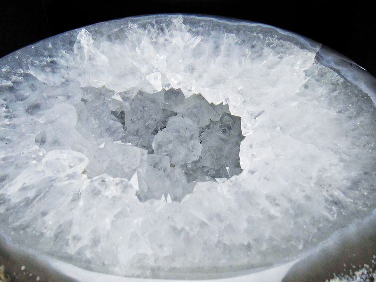 アゲート(瑪瑙)の原石を二つに切ったもので、中には空洞があり、周囲にびっしりと水晶の結晶が並んでいるパワーストーンです。このぽっかりと開いたくぼみ(龍穴)に気が集まるスポットが作り出され、運気上昇に繋がるとされます。龍穴(りゅうけつ)とは、風水における繁栄する土地の事で、龍穴がある場所は天変地異とも無縁であるとされます。