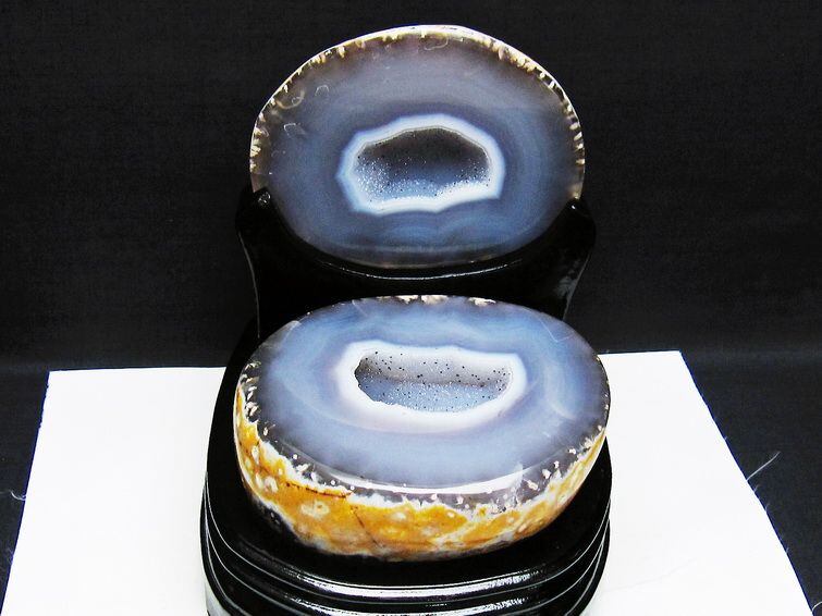 アゲート(瑪瑙)の原石を二つに切ったもので、中には空洞があり、周囲にびっしりと水晶の結晶が並んでいるパワーストーンです。このぽっかりと開いたくぼみ(龍穴)に気が集まるスポットが作り出され、運気上昇に繋がるとされます。龍穴(りゅうけつ)とは、風水における繁栄する土地の事で、龍穴がある場所は天変地異とも無縁であるとされます。