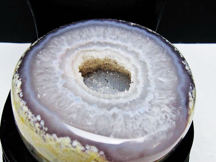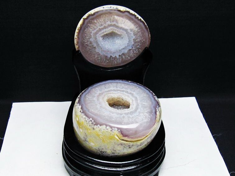 アゲート(瑪瑙)の原石を二つに切ったもので、中には空洞があり、周囲にびっしりと水晶の結晶が並んでいるパワーストーンです。このぽっかりと開いたくぼみ(龍穴)に気が集まるスポットが作り出され、運気上昇に繋がるとされます。龍穴(りゅうけつ)とは、風水における繁栄する土地の事で、龍穴がある場所は天変地異とも無縁であるとされます。
