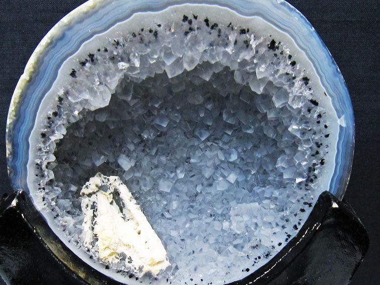 アゲート(瑪瑙)の原石を二つに切ったもので、中には空洞があり、周囲にびっしりと水晶の結晶が並んでいるパワーストーンです。このぽっかりと開いたくぼみ(龍穴)に気が集まるスポットが作り出され、運気上昇に繋がるとされます。龍穴(りゅうけつ)とは、風水における繁栄する土地の事で、龍穴がある場所は天変地異とも無縁であるとされます。