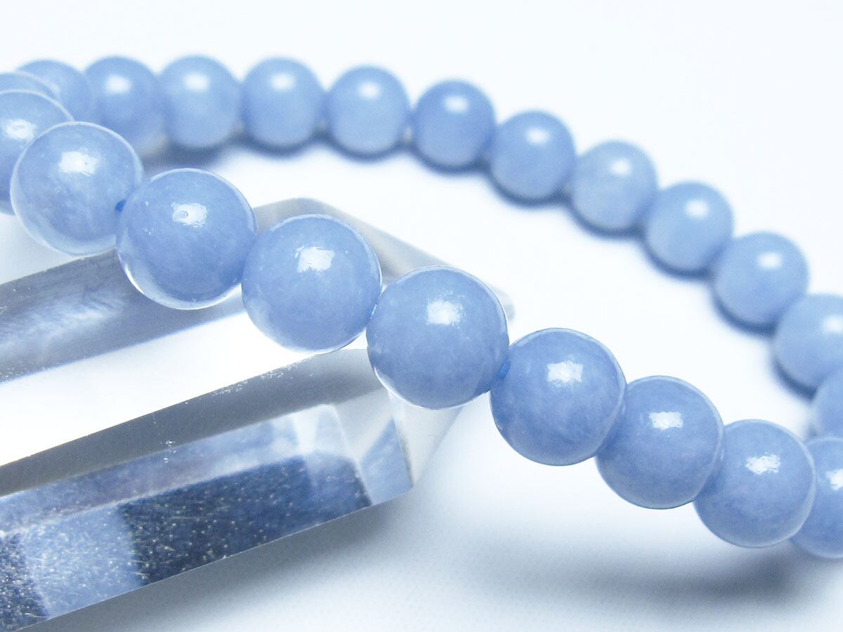 エンジェライトは、ストロンチウムを含むアンハイドライト(硬石膏)の一種で、セレスタイトに近い石であり、硬度も3.5と柔らかい為取り扱いには注意が必要です。名前の由来は、美しい空色が天使を彷彿とされることから付けられたと言われています。「天使の石」とも称され、包み込むような優しい癒しのエネルギーを持つとされます。