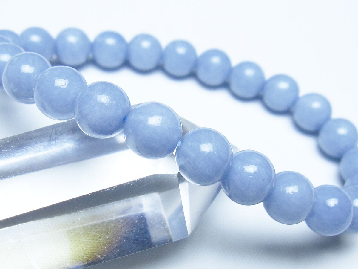 エンジェライトは、ストロンチウムを含むアンハイドライト(硬石膏)の一種で、セレスタイトに近い石であり、硬度も3.5と柔らかい為取り扱いには注意が必要です。名前の由来は、美しい空色が天使を彷彿とされることから付けられたと言われています。「天使の石」とも称され、包み込むような優しい癒しのエネルギーを持つとされます。