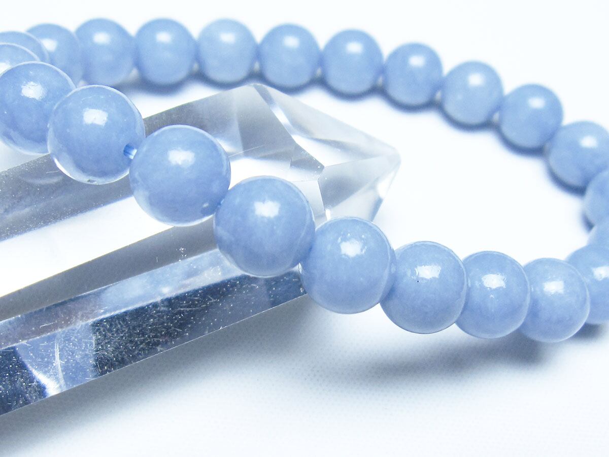 エンジェライトは、ストロンチウムを含むアンハイドライト(硬石膏)の一種で、セレスタイトに近い石であり、硬度も3.5と柔らかい為取り扱いには注意が必要です。名前の由来は、美しい空色が天使を彷彿とされることから付けられたと言われています。「天使の石」とも称され、包み込むような優しい癒しのエネルギーを持つとされます。