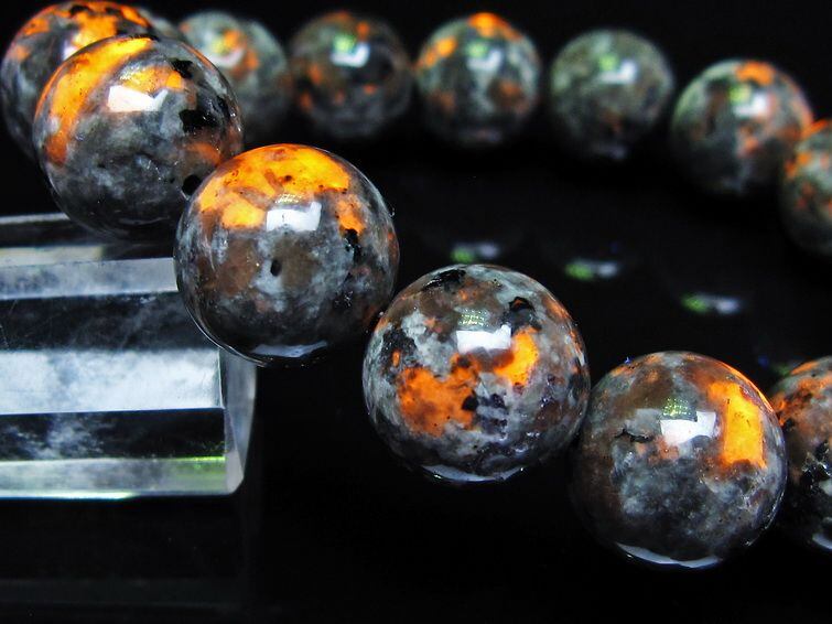 自然光の下では変哲の無い石ですが、ブラックライトなどの紫外線を照射すると強いオレンジ色の蛍光が確認できます。