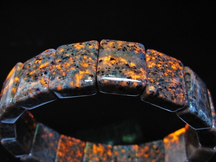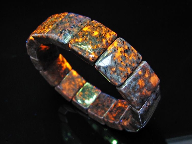 自然光の下では変哲の無い石ですが、ブラックライトなどの紫外線を照射すると強いオレンジ色の蛍光が確認できます。