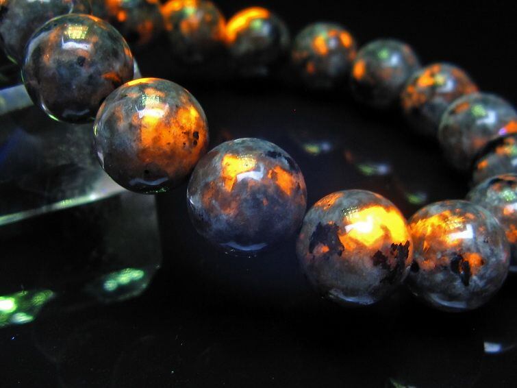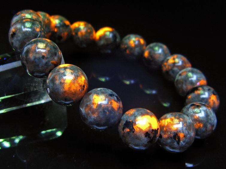 自然光の下では変哲の無い石ですが、ブラックライトなどの紫外線を照射すると強いオレンジ色の蛍光が確認できます。